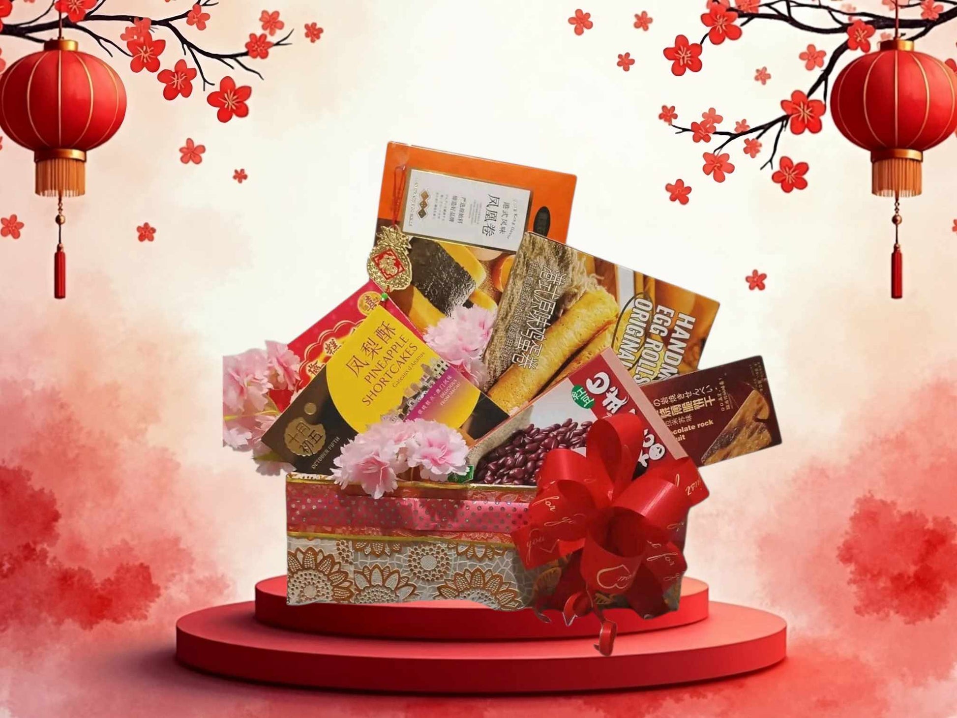 Send CNY hamper wishing a meteoric rise in achievements and more with a booty of Oriental Cookies and goodies in a traditional Wooden basket accessorized with festive ribbons. This CNY hamper include,