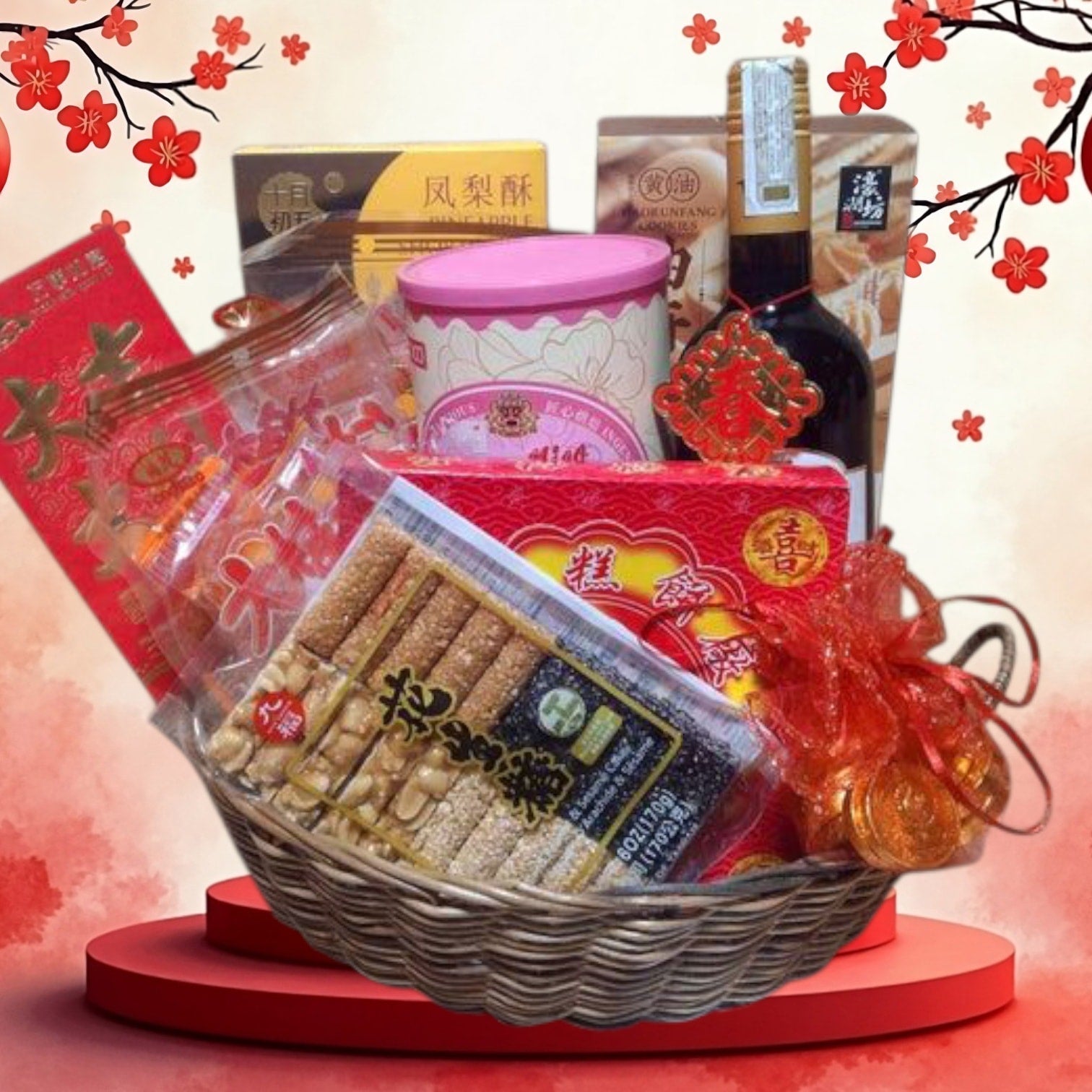 Send CNY hamper wishing a meteoric rise in achievements and more with a booty of Oriental Cookies and goodies in a traditional basket accessorized with festive ribbons. This CNY hamper include,