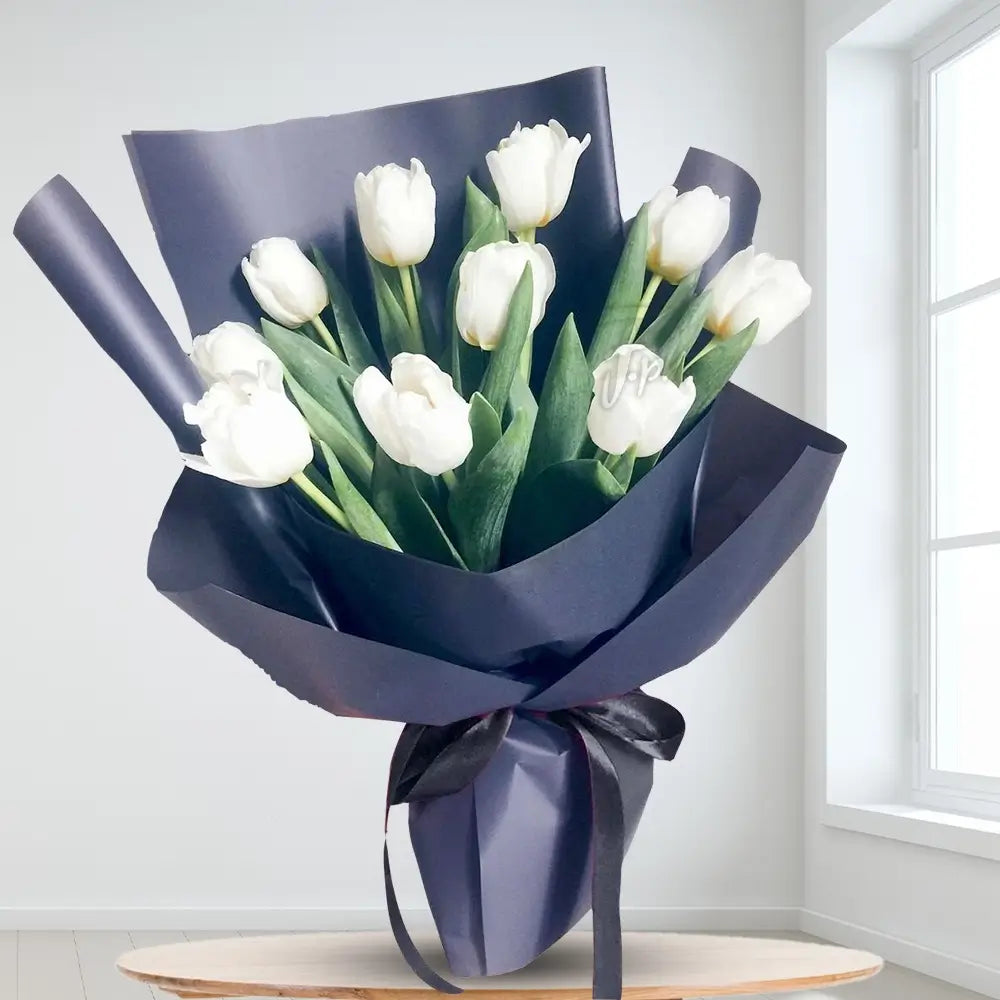 Bouquet of 10 stems of White Tulips in nice black wrapping