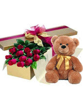 12 red roses in an elegant two-tone gold and scarlet presentation box accompanied by Benson the Bear - a large soft brown teddy bear with a golden bow and a winning smile. Melt someones heart today with this ultra-stylish gift.