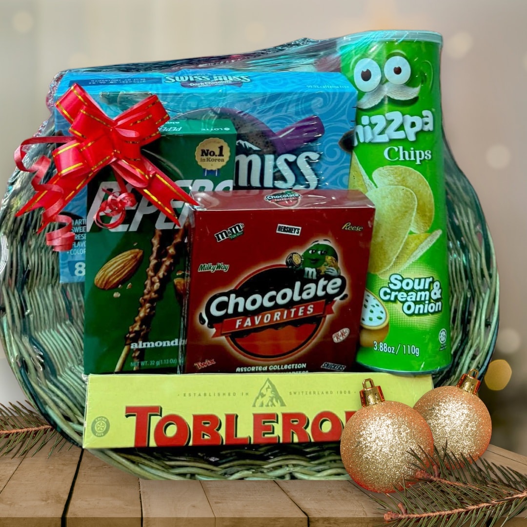 Wicker basket + decoration ribbon + transparent plastic wrapping + message card +