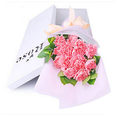 12 pink carnations with greens, hand bouquet arranged in a box.(box color vary locally)
