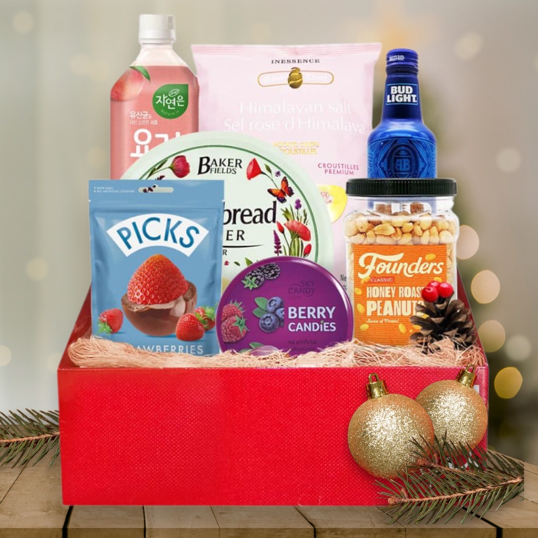 Celebrate the holidays with the Jolly Surprise Ready-Made Gift Basket (S) — a delightful assortment of snacks, sweets, and drinks that bring festive cheer to every occasion. Featuring treats like Inessence Cheese Potato Crisps, Pergale Picks Almonds Caramel Glaze, and Budlight Beer, this basket offers a perfect mix of savory and sweet indulgence. It's an ideal Christmas gift for family, friends, or colleagues. Please note that item substitutions of equal value may occur depending on availability.